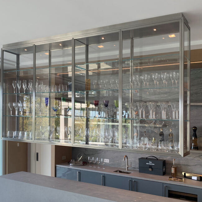 Our floating glass and stainless steel cabinetry is engineered, designed, and fabricated using ultra-thin framing systems. These cabinets are extremely heavy and require structural concealed supports in the wall or ceiling. Ideal and popular uses include Kitchen Cabinets, Pantry Cabinets, Bar Cabinetry, Trophy Cases and Memorabilia Displays.